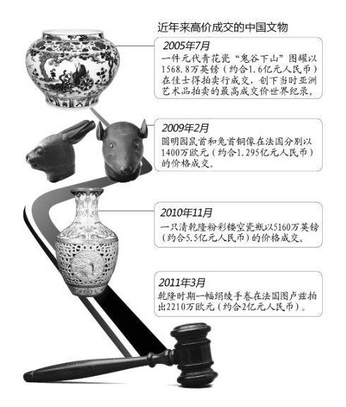 據(jù)聯(lián)合國教科文組織統(tǒng)計(jì),流失到中國境外的中國文物約164萬件,分散在全世界47家博物館,海外民間的收藏預(yù)計(jì)是館藏的10倍。近年來,中國文物成了拍賣市場的搶手貨,價(jià)格動(dòng)輒上千萬。