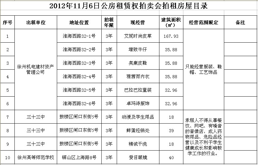 我公司受徐州市市級機(jī)關(guān)事務(wù)管理局、徐州產(chǎn)權(quán)交易所委托,定于2012年11月6日10時在中山南路55號拍賣廳公開拍賣以下公有房屋三年期租賃權(quán):
