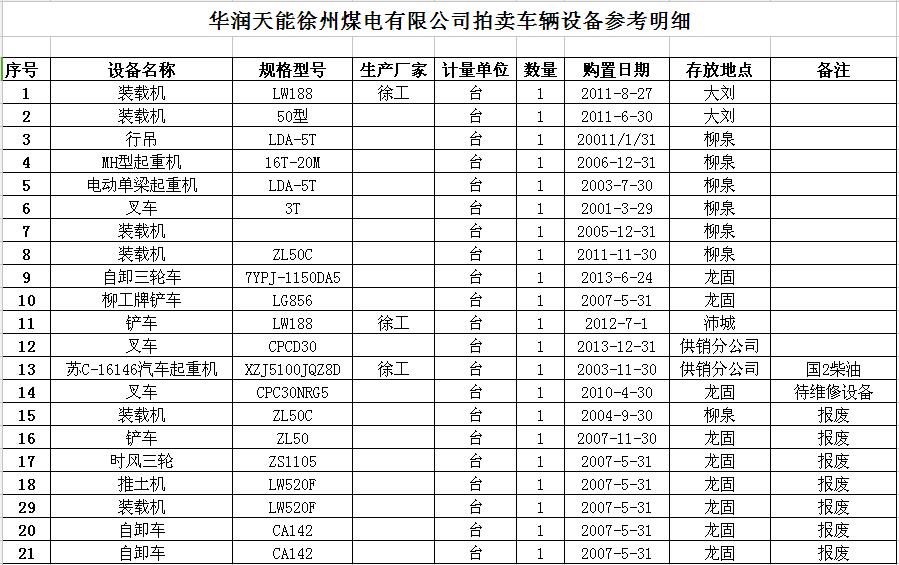 我公司受委托,定于2017年4月12日10時(shí)在徐州市中山南路55號(hào)7樓本公司大廳公開(kāi)拍賣(mài)華潤(rùn)天能徐州煤電有限公司各型車(chē)輛設(shè)備約二十余臺(tái),主要包括各型裝載機(jī)、叉車(chē)、起重機(jī)、鏟車(chē)、推土機(jī)、自卸車(chē)等。