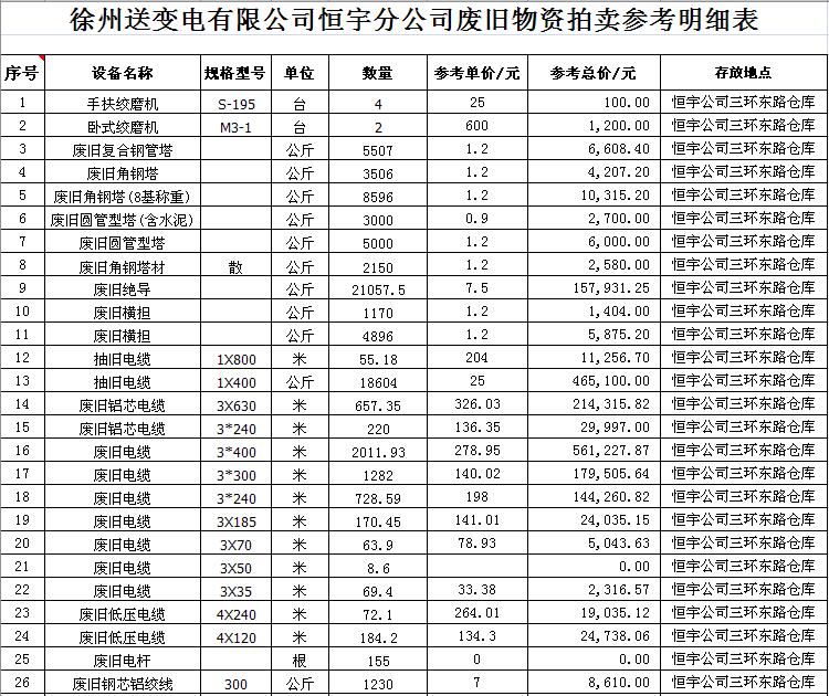 受江蘇徐供、淮供集體資產(chǎn)運(yùn)營(yíng)中心委托,我公司將通過(guò)中國(guó)拍賣行業(yè)協(xié)會(huì)網(wǎng)絡(luò)拍賣平臺(tái)以網(wǎng)絡(luò)競(jìng)價(jià)的方式公開拍賣以下單位的廢舊物資各一批: