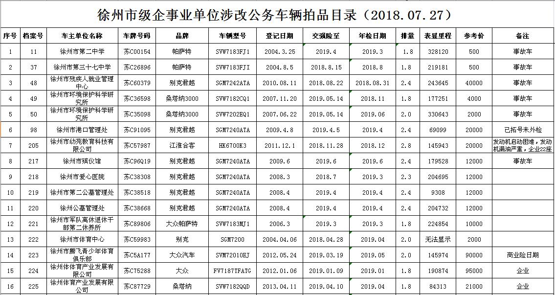 受委托,五家拍賣公司聯(lián)合舉行“徐州市企事業(yè)單位改革公務車輛聯(lián)合拍賣會”。拍賣時間:2018年7月27日上午9:30。
