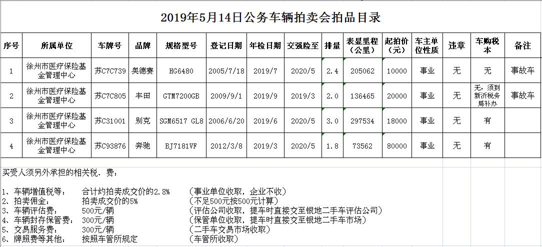 受委托,我公司定于2019年5月14日10時(shí)在徐州市中山南路55號(hào)本公司拍賣廳通過現(xiàn)場和中國拍賣行業(yè)協(xié)會(huì)網(wǎng)絡(luò)拍賣平臺(tái)結(jié)合拍賣的方式公開拍賣以下車輛: