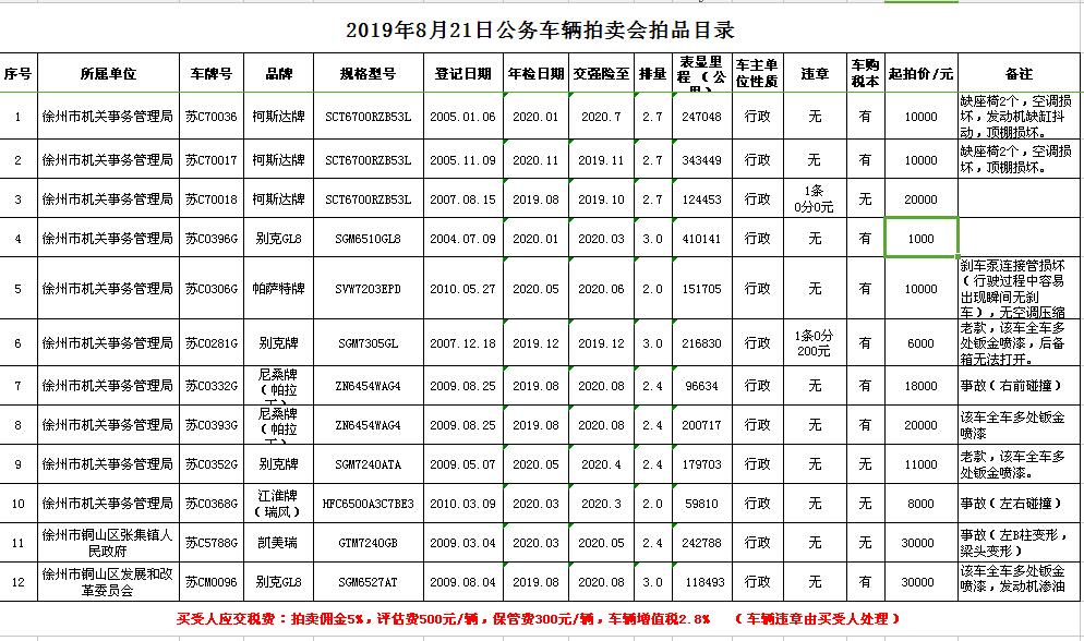 受委托,我公司定于2019年8月21日13:00時(shí)在徐州市銀地二手車交易市場四樓東南拍賣大廳通過現(xiàn)場和汽車街網(wǎng)絡(luò)拍賣平臺(tái)同步進(jìn)行的方式公開拍賣以下公務(wù)車輛: