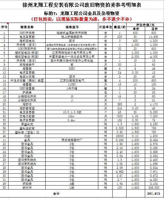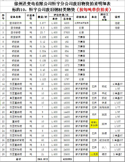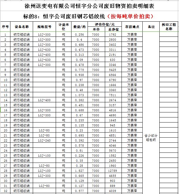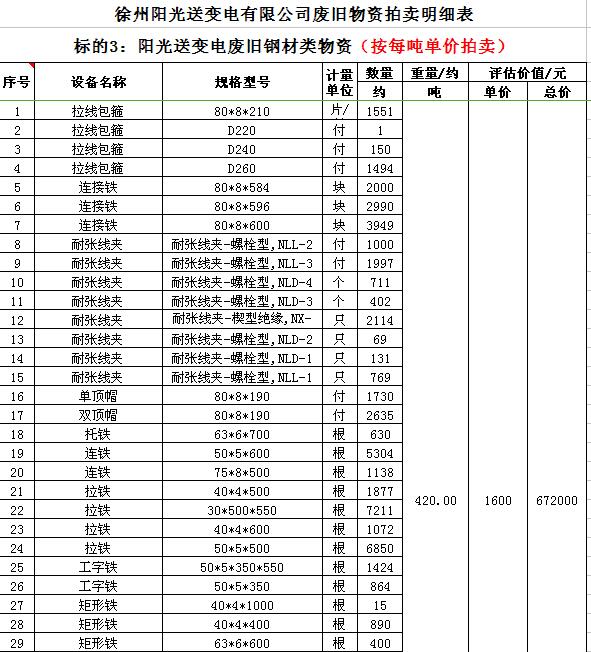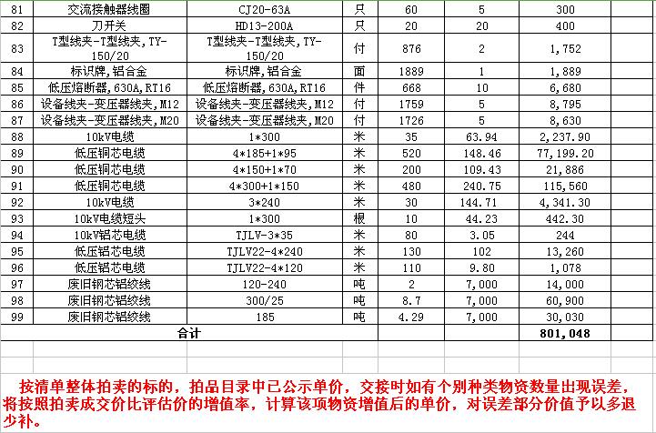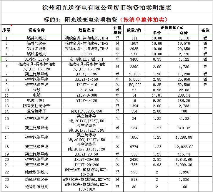 受委托,我公司將通過中國拍賣行業(yè)協(xié)會網(wǎng)絡(luò)拍賣平臺以網(wǎng)絡(luò)競價的方式公開拍賣以下公司廢舊電力物資。主要包含:廢銅排下腳料、廢不銹鋼、辦公設(shè)備等;架空絕緣導(dǎo)線、電纜、金具、角鋼塔、鋼芯鋁絞線、開關(guān)、互感器、變壓器散件等。