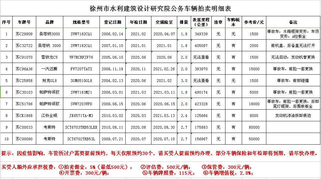 受委托,我公司定于2020年4月1日13:00時(shí)在徐州市銀地二手車(chē)交易市場(chǎng)四樓東南拍賣(mài)大廳通過(guò)現(xiàn)場(chǎng)和汽車(chē)街網(wǎng)絡(luò)拍賣(mài)平臺(tái)同步進(jìn)行的方式公開(kāi)拍賣(mài):徐州市水利建筑設(shè)計(jì)研究院公務(wù)車(chē)輛10輛,主要車(chē)型有帕薩特、桑塔納、雪鐵龍C5、邁騰、全順、GL8、考斯特等。