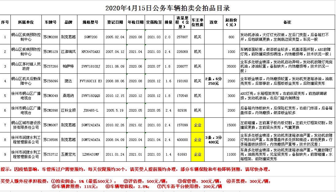 受委托,我公司定于2020年4月15日13:30時(shí)在徐州市銀地二手車交易市場(chǎng)四樓東南拍賣大廳通過現(xiàn)場(chǎng)和汽車街網(wǎng)絡(luò)拍賣平臺(tái)同步進(jìn)行的方式公開拍賣以下車輛:①05年蘇CM0288君越;②07年蘇CM5129江淮瑞風(fēng);③11年蘇C5726G帕薩特;④10年蘇CM6067君越;⑤08年蘇C38586君越;⑥11年蘇C53712五菱宏光;⑦08年蘇C5609G捷達(dá);⑧10年蘇CM0049桑塔納;⑨05年蘇CM2898江鈴全順。