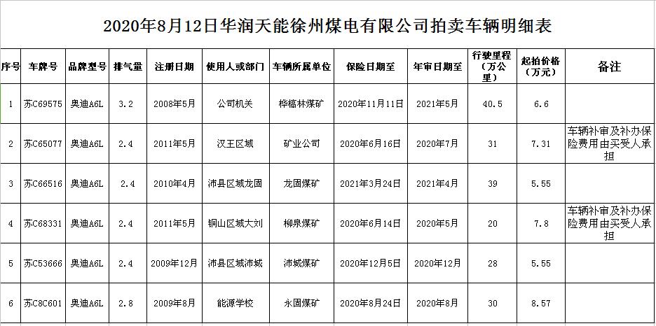 受委托,我公司定于2020年8月12日14:00時通過中拍平臺和現(xiàn)場結(jié)合方式公開拍賣:華潤天能徐州煤電有限公司奧迪公務(wù)車6輛。