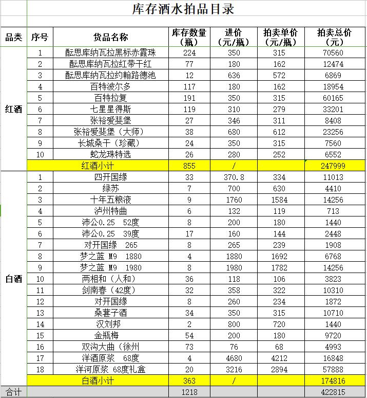 受委托,我公司定于2021年1月22日10時在中拍平臺公開拍賣:庫存精品紅酒、白酒一批。該批酒類為單位庫存接待用酒,均有進(jìn)貨發(fā)票,部分為收藏酒。