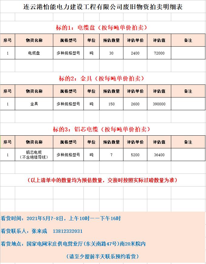 1、連云港怡能電力建設工程有限公司廢舊物資。主要包含:廢舊鋁芯電纜、金具、電纜盤、雜項物資等。(保證金10萬元)