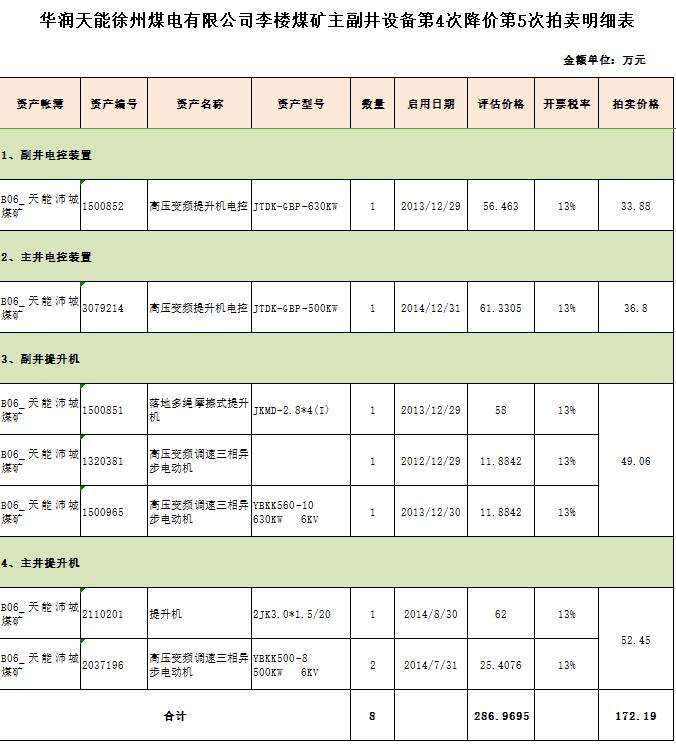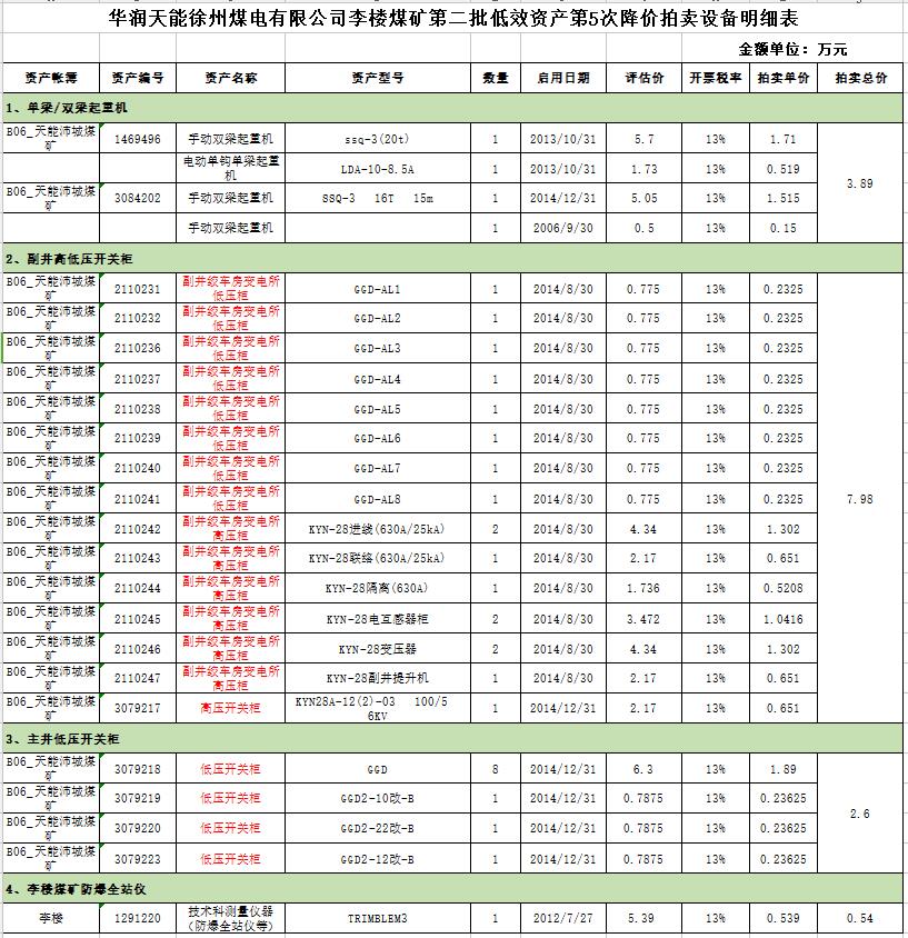 2、華潤天能李樓煤礦二手礦用設備一批。主要包括:主副井提升機、主副井電控裝置、單雙梁起重機、副井高低壓開關(guān)柜、主井低壓開關(guān)柜、防爆全站儀等。(保證金10萬元)