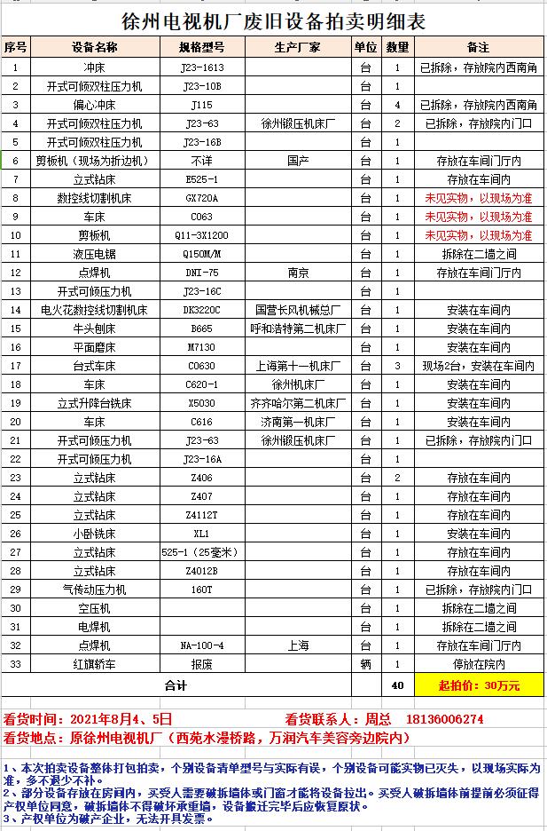 我公司受委托,定于2021年8月6日上午10時(shí)(延時(shí)除外)在中拍平臺(tái)公開拍賣:徐州電視機(jī)廠廢舊設(shè)備一批。主要包含:沖床、壓力機(jī)、折邊機(jī)、鉆床、機(jī)床、車床、刨床、磨床、銑床等、空壓機(jī)、電焊機(jī)等。